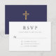 Personalisierte marineblaue Konfirmations-RSVP-Karte mit religiösem Kreuz für Jungen. Teil des marineblauen Konfirmations-Einladungssets für Jungen mit passender Einladung, Korrespondenzartikeln und Party-Accessoires.