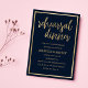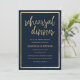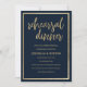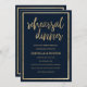 Eine Vintage marineblaue und goldene Thema Schreibmaschine mit Gold Schriftart Typografie rustikalen Stil Hochzeit Probe Dinner Einladungen. Ideal für jedes raffinierte und raffinierte Mädchen oder jeden. Dieses Design eignet sich ideal für ein trendiges und elegantes Party-Event. Passen Sie dieses Design mit Ihren eigenen Nachrichten und personalisierten Informationen an. Alle Designs sind gedruckt.