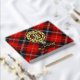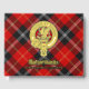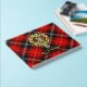 Clan Marjoribanks Wappen Abzeichen umgeben von einem Gurt und Schnalle über Tartan Hintergrund. Benutzerdefinierter Vorder-, Rücken- und Rückentext.