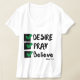 Das Design des v-Nacken-T - Shirt basiert auf der Mark-11:24-Bibelschrift, die das Wort "Verlangen, Beten, Glauben" anzeigt. Ein farbiger Schriftart mit schwarzen Buchstaben und grünen und schwarzen Checklisten sowie Bibelzitat in diesem KJV-Glaube-Zitat. Dieser Tee ist konfektioniert und seitengesteppt für eine weibliche, mit leichtem Stoff für Komfort.