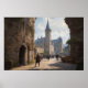 A medieval town scene features stone buildings and a central church with a tall spire, bustling with people walking along the cobblestone street. Vendors sell goods from carts, adding life and vibrancy to the historic setting.