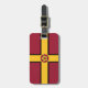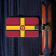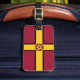 Gepäckmarke mit Design mit einer Fahne des historischen Landkreises von Northamptonshire in England, Großbritannien; Maronflagge mit Goldkreuz und die traditionelle Rose des Landkreises in der Mitte