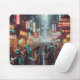 Ein überfüllter Markt für Cyberpunk-Straßen mit Roboterhändlern, mehrsprachigen Neonschildern und Menschen, die AR-Visitors tragen.