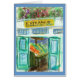 Ein gelbes Schild markiert den Eingang zum Pike Place Market. Durch die grünen Türen ist ein Produktionsstand sichtbar. Farbenfrohe Blume kaskadierten von einer Pflanze über der Tür. Ausgerendert in Acryl und Pastellfarben auf Papier.