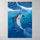 Kleine Fische streuen, als ein riesiger Blue Marlin mit einer Geschwindigkeit auf die Meeresoberfläche schwimmt.