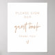 Dieses Schild "Bitte unterschreiben Sie unser Gästebuch" enthält einen edlen handgeschriebenen Schriftart mit einer inspirierten Farbkombination aus Backbeige und Terrakotta. Alle Farben sind editierbar, um Ihrem Thema zu entsprechen!