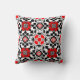 Throw pillow in an Art Deco Moroccan til pattern based on stylized flowers and leaves - deep Chinese red with classic black and white, accented with silver gray / grey