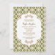 Elegante und wunderschöne französische marokkanische Braun-Dusche-Einladungen mit wiederholenden Oliven-Grün-und Gold geometrischen Mustern und goldfarbenen Schnörkeln mit Blumenmotiven . Dieses luxuriöse Brautparty eignet sich hervorragend für alle formalen, exotischen, marokkanischen, arabischen oder Aladdin-Themenabende. Die Rückseite dieser extravaganten Rahmeneinladungen und Ankündigungen kann personalisiert werden, mit dem demnächst erscheinenden Monogramm der Braut und dem Veranstaltungsnamen auf der Quarrefolienform und dem bedruckten Banddesign. Kunstwerk und Design © Chrissy H. Studios, LLC.Alle Rechte vorbehalten.