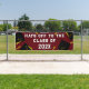 Creative Class von 25 Abschluss Gratulationen Banner mit schwarzen und goldenen Graduiertenkappen auf einem maroon Hintergrund. Bearbeiten Sie Text, um das Senior Class Year zu ändern.