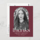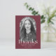 Moderner Abschluss danken Ihnen die Postkarte mit dem Foto des Absolventen gerahmt durch einen maroonbogenförmigen Rahmen. "Danke" wird in weißer, modernisierter Schrift dargestellt. Personalisieren Sie die Vorderseite des trendigen Abschlusses danke Postcard, indem Sie den Namen des Absolventen, den Namen der Schule und Abschluss Jahr. Die Postkarte kehrt zurück, um Ihre Rücksendeadresse und benutzerdefinierte Nachricht anzuzeigen.