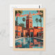 Eine bezaubernde Postkarte aus der Mitte des Jahrhunderts, die die pulsierende Stadt Marrakesch zeigt. Die Gebäude aus rotem Lehm und die Palmen sind in warmer Sonne gehalten und mit einem erfrischenden Außenpool und Liegestühlen ausgestattet. Weiche Farbtöne in Orange, Rosa, Grün und Blau unterstreichen die Szene, während die Reflexionen über das Wasser die Tiefe und Ruhe verleihen.