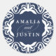 Siegel Sie Ihre Hochzeitseinladung Kuverts, Favoriten und mehr mit unseren eleganten marokkanischen inspirierten Aufkleber in Marine und Weiß. Rund Design mit Namen verbunden durch dekorative Skripte und umgeben von einem geometrischen Rahmen in weiß auf einem klassisch marineblau Hintergrund. Koordiniert mit unserer Hochzeitseinladungskollektion in Marrakesch.