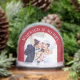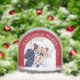 A keepsake red snow globe to celebrate your first Christmas as newlyweds featuring two wedding photos in arch frames and "Married & Merry" in elegant white serif typography.