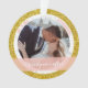 Splashy aber elegant "Marrily ever after" (die Sie in "Merrily ever after", wenn Sie wollen) Unsere ersten Weihnachten als Mr. und Mrs. [Familienname] personalisiertes Foto Weihnachtsschmuck für Jungvermählte, mit moderner kursiver Typografie / Handschrift auf einem stilvollen halbtransparenten pfirsichrosa Band, einem Rahmen aus weißen und silbernen Schneeflocken und kleinen Sternen, und einem weiteren Rahmen von simuliertem goldenen Glitzer. Stellen Sie sicher, dass Sie mindestens die beiden Fotos (vorne und hinten), den Familiennamen vorne und die Vornamen und das Jahr hinten personalisieren.