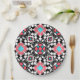 Die Teller sind in einem marokkanischen Art-Déco-Fliesenmuster mit stilisierten Blume und Blätter gehalten. Schwarz-Weiß mit Korallenrosa, türkisblau