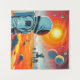 Ein einsamer Astronaut steht auf einer felsigen Landschaft der Alien und blickt auf eine massive Roboterstruktur mit einer klaren Kuppel und mechanischen Beinen. Mehrere Planeten sind am Himmel sichtbar, was eine beeindruckende Szene der Weltraumforschung schafft.