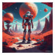 Ein einsamer Astronaut steht auf einer felsigen Landschaft der Alien und blickt auf eine massive Roboterstruktur mit einer klaren Kuppel und mechanischen Beinen. Mehrere Planeten sind am Himmel sichtbar, was eine beeindruckende Szene der Weltraumforschung schafft.