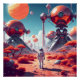 Ein einsamer Astronaut steht auf einer felsigen Landschaft der Alien und blickt auf eine massive Roboterstruktur mit einer klaren Kuppel und mechanischen Beinen. Mehrere Planeten sind am Himmel sichtbar, was eine beeindruckende Szene der Weltraumforschung schafft.