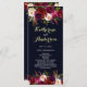 Bohemische Style Wedding Program Card mit Aquarellbild von bordeauxroten, roten und rosa Pfannkuchen und Rose mit Federakzent. Das ist perfekt für den Herbst | Herbst und Winter Hochzeit Einladung. Matching-Elemente sind ebenfalls verfügbar.