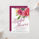 Eine kühne und farbenfrohe Brautdusche mit einem blumengeschmückten Blumenstrauß aus grünen Blätter und Blume in Marsala und Rot. Unten befindet sich "Brautparty" in marsala modernen kalligraphischen Schriftart. Die Duschdetails sind in einer Mischung aus Serif und Sans Serif Schriftart, und die Rückseite der Einladung ist in Massivmarsala.