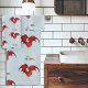 Ein niedlicher, kleiner, roter Drache knurrt in einem Martini-Glas zu einer grünen Olive