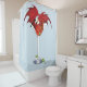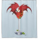 Ein niedlicher, kleiner, roter Drache knurrt in einem Martini-Glas zu einer grünen Olive