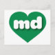 Diese Postkarte zeigt ein lebendiges, grünes Herz, das die fett-, weiß-, abgerundeten Kleinbuchstaben md enthält, eine spielerische Abkürzung für Maryland, den alten Staat der Linie. Die Rückseite der Postkarte ist leer und wartet auf Ihren personalisierten Text oder Ihre handgeschriebenen Gefühle.