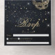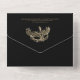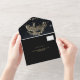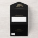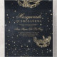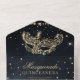 Eine moderne, schicke und glamouröse QUINCEAÑERA mit einer handgezeichneten goldenen Glitzer Maskerade Maske mit vergoldeten Glitzer-Diamant-Glitzern auf einem schwarzen Aquarell mit uAwg alles in einer Einladung.