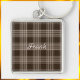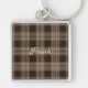 Schöner, maskulinarischer brauner und beigefarbener karierter Schlüsselanhänger. Fügen Sie Ihren Namen zu personalisieren. Gutes Geschenk für ihn!