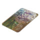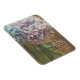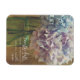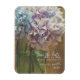 Eine Hochzeit speichert den Datums-Magneten mit einem Foto von blauen und lila Hydrangeas in einem Maurerkirsch über einem Stallholzhintergrund.