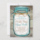 Rustikale Country Mason Jar Bachelor Party Einladungen mit einem aquamarinen blauen Akzent Kugel Konservendose auf einem gedruckten Stallholz Hintergrund. Fügen Sie Ihre eigene Formulierung zu diesem individuellen Template hinzu: Country Bachelor Party Einladungen, rustikale Bachelor Party Einladungen, Mason Jar Bachelor Party Einladungen.