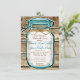 Rustikales Land Mason Jar Probe Dinner Einladungen mit aquamarinem blauen Akzent auf einem gedruckten Stallholzhintergrund für ein rustikales Hochzeitsthema.