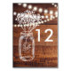 MASON JAR WEDDING TABLE CARDS DES RUSTISCHEN LANDES | Hölziger Hintergrund mit Lichterfolge, Maurerkirsche mit Blume des Babyatmens und der Tischnummer.