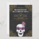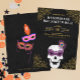 Set den Ton für einen eleganten und unheimlichen Abend mit dieser Maskerade Halloween-Einladung. Ein weißer Schädel mit einer lila Maske mit Pfauenfeder, goldenen Spinnennetzen und Maskengrafiken auf schwarzem Hintergrund - ideal für Kostümbildchen mit Flair. Vollständig anpassbar mit Datum, Ort und UAWG. Ideal für Erwachsene-nur-Halloween-Partys, Veranstaltungen mit schwarzer Krawatte oder Maskengalas.
