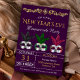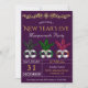 In dieser eleganten Silvesternacht-Party Einladung mit wunderschönen Maskenmasken mit moderner Typografie vor einem lila Hintergrund laden Sie Ihre Gäste ein. Fügen Sie einfach Ihre Veranstaltungsdetails zu dieser einfach zu bedienenden Vorlage hinzu, um sie zu einer einmaligen Einladung zu machen. Dreh die Karte um, um ein lila und weißes Streifen-Muster auf der Kartenrückseite zu erkennen.
