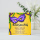 Quadratische Einladungen mit funkelnd lila Maske mit grünen und lila Perlen auf gelbem Hintergrund.