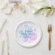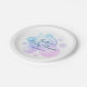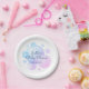 Individuell gestaltete Babydusche-Teller mit Seifenblasen. Elegante Vorlage mit Namen des untergeordneten Elements und Datum. Skripttypografie. Geeignet für Neugeborene oder Mädchen. Personalisieren Sie mit Ihrem eigenen Text. Niedliches Party für Feiern mit Freunden und Familie.
