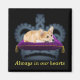 Ein trauriger Korgi, der auf einem lila Kissen liegt, mit Goldblechen, einer Krone im Hintergrund, vollständig anpassbarer Text