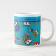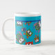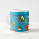 Eine lustige, individuell gestaltbare Jumbo-Sized Coffee Tasse mit einem Muster niedlicher Eulen in Rot, Blau, Grün auf türkisblauem Hintergrund. Das Eukalyptmuster stammt aus einer handbemalten, von Judy Adamson entworfenen Collage.