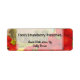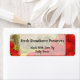 Ein benutzerdefiniertes Konserven-, Konfitüren- oder Backlabel mit Retro-Skript und Blockbriefen für Ihr Unternehmen oder Ihren Namen und Kontaktinformationen auf einem Hintergrund Vintager hellroter Erdbeeren.