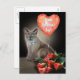 Katzenjacke hinter einem Strauß von Rose und schau auf einen herzförmigen Ballon, der "Happy Valentine's Day!" sagt (ändere den Text gerne)