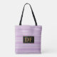 Diese modische Tasche mit lila und weißen Streifen verleiht ihr einen zeitlosen und trendigen Look. Fügen Sie Ihre Initialen hinzu, um es einzigartig zu machen. Ob Sie nun im Einkaufszentrum, im Lebensmittelgeschäft oder einem lässigen Ausflug sind, diese Tasche ist das perfekte Accessoire, um Ihr Outfit zu vervollständigen und Ihre Essenzen an einem Ort behalten. Machen Sie eine Erklärung und bestellen Sie noch heute!