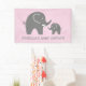 Maßgeschneidertes Bannerzeichen mit grauen Elefanten. Qualität im Innen- und Außenbereich. Elegantes personalisiertes Pink-Weiß-Polka-Punktmuster. Niedliches Design mit Tierabbildungen in Zoo. Whimsikale Typografie. Erhältlich in verschiedenen Größen für innen und außen. Kleine, mittlere und große Formen. Mit oder ohne Löcher und Haken. Rosa und weiß oder anpassbare Hintergrundfarbe. Fügen Sie der Vorlage den Namen hinzu. Babydusche Accessoires mit grauem Kalb. Punkt drucken Hintergrund. Geschlechtsneutrales Design für Mädchen oder Jungen.