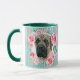 Ein wunderschönes Aquarellkunstwerk mit dem Gesicht eines englischen Mastiff-Hundes, umgeben von hübschen Blume mit blühender Rose in Rosa und Orange, die einen Kranz aus Olivenblättern schmücken und einen Rahmen um den Hund bilden, das ganze Set über mit einem gestressten, vertikal gestreiften, rosa und grünen Hintergrund. Wählen Sie Ihre Tasse Größe, Farbe und Stil.