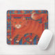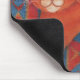 Eine Marmeladenkatze, die auf einer rot-blauen und gelben, zum Thema Fische stehenden Matte ist. Entwurf von "Mat Cats", einem von Jessperre gezeichnet, farbigen Stift