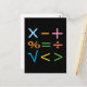 Mathematik Mathematik Symbol Mathematik Postcard Original-Design von Nisha Prabhu. Die neue Postkarte "Mathe Symbol Mathematics" - eine perfekte Mischung aus farbenfroher Kreativität und mathematischem Charme! Dieses auffallende Design verfügt über eine Reihe von fett formatierten Mathematiksymbolen, die alle Set vor einem atemberaubenden Hintergrund mit schwarzer Farbe tragen. Ob Mathe-Enthusiast, engagierter Schüler oder stolzer Lehrer - diese Postkarte inspiriere und erfreut sich. Verwenden Sie es, um eine Ermutigung zu senden, einen mathematischen Witz zu teilen oder einfach die Liebe für Mathematik zu verbreiten. Diese Postkarte ist perfekt für Klassenräume, Studiengruppen oder nur um den Tag eines Menschen zu heitern, ist mehr als nur ein Schreibstück; sie ist eine Feier der Schönheit der Mathematik! Holen Sie sich noch heute Ihren und lass den mathematischen Zauber!