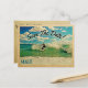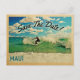Vintage Maui Save the Date Postkarten mit einem Surfer, der in einem türkisblauen Wasser mit puffblauen Wolken über einer Welle reitet. Dieses coole Retro-Design aus der Mitte des Jahrhunderts ist der perfekte Weg, um Gäste zu Ihrer Hochzeit in Urlaubsort Maui Hawaii zu treffen.