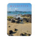 Ein wunderschöner Ausblick auf den Strand und die Schiffe auf Mauritius, der auf einem Souvenirladen-Kühlschrankmagnet gedruckt ist.
