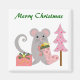 Eine niedliche Szene mit einer grauen Weihnachtsmaus mit einem rosa Strumpf voller Käse.
