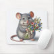Eine lächelnde graue Maus mit einem Wildblume-Bouquet auf weißem Hintergrund abgeschieden